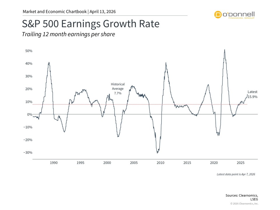 Amid the uncertainty around geopolitics, inflation, and employment, one positive area for investors has been the strength of corporate earnings. Despite the challenges described above, what’s interesting is that consumers have continued to spend, and profit margins have remained high for many companies. Current Wall Street estimates suggest that S&P 500 earnings-per-share have grown approximately 16% over the past twelve months, with expectations for an additional 18% growth over the coming year. These are historically strong numbers, well above the long-term average growth rate of 7.7%.