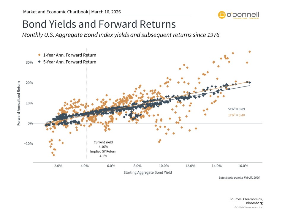 For long-term investors, bond yields remain attractive compared to the previous decade. Current bond yields offer meaningful income potential that was simply unavailable during much of the past decade. Specifically, the yield on the U.S. Aggregate Bond Index is 4.5%, well above the 2.9% average since 2009. Investing when yields are attractive is also historically correlated with healthy total returns, as shown in the accompanying chart.
