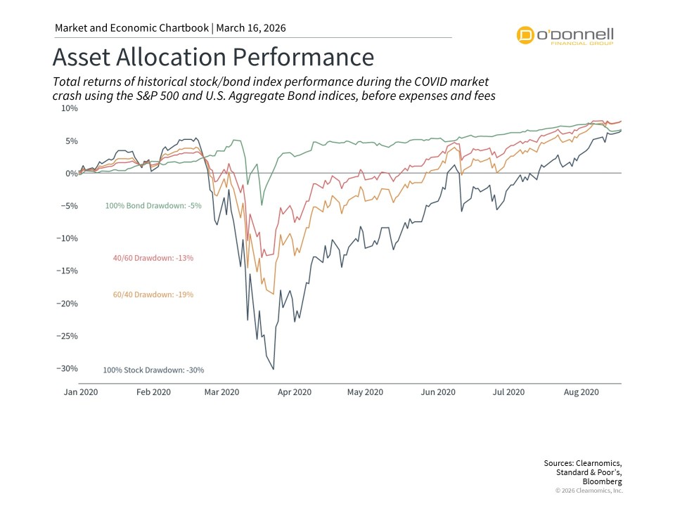 The accompanying chart highlights one of the most volatile periods in history during the pandemic in 2020. Different asset allocations behaved in unique ways, with those that were more balanced across asset classes experiencing smaller swings. While these portfolios all ended around the same level after this period, the real issue is whether investors would have overreacted when the stock market was down 20% or 30%.