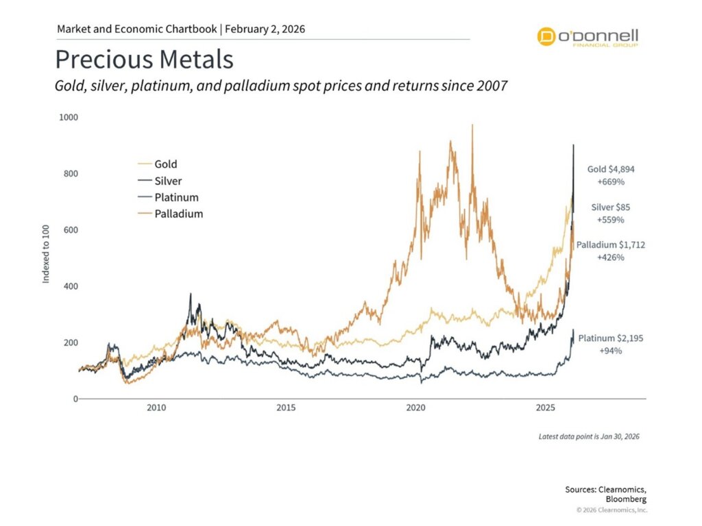 The bottom line? January experienced market volatility due to geopolitics, the Fed, and more. However, markets were resilient and healthy corporate earnings have helped major indices reach new all-time highs, even as precious metals stumbled. For long-term investors, this underscores the importance of maintaining a proper asset allocation that is aligned to financial goals.