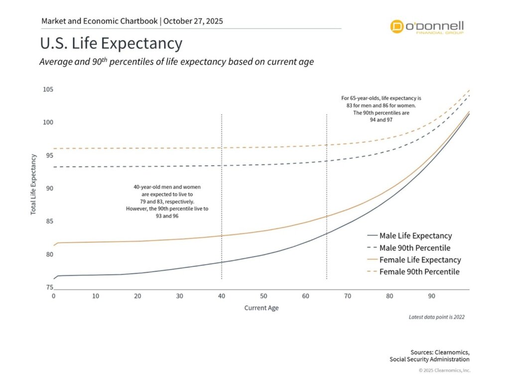 According to the latest Social Security Administration data, 40-year-old men and women have an average life expectancy of 79 and 83, respectively. However, for those who make it to 65 years of age, their life expectancies increase to 83 and 86. These are just averages – those in the 90th percentile could live to 94 and 97, respectively.